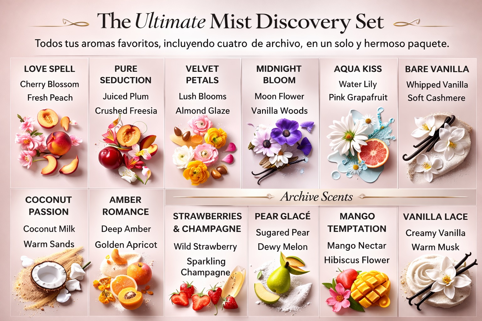 | Fragancia | • Velvet Petals • Pure Seduction • Temptation • Strawberries & Champagne • Amber Romance • Mango Temptation • Bare Vanilla • Coconut Passion • Pear Glace • Aqua Kiss • Midnight Bloom • Love Spell |