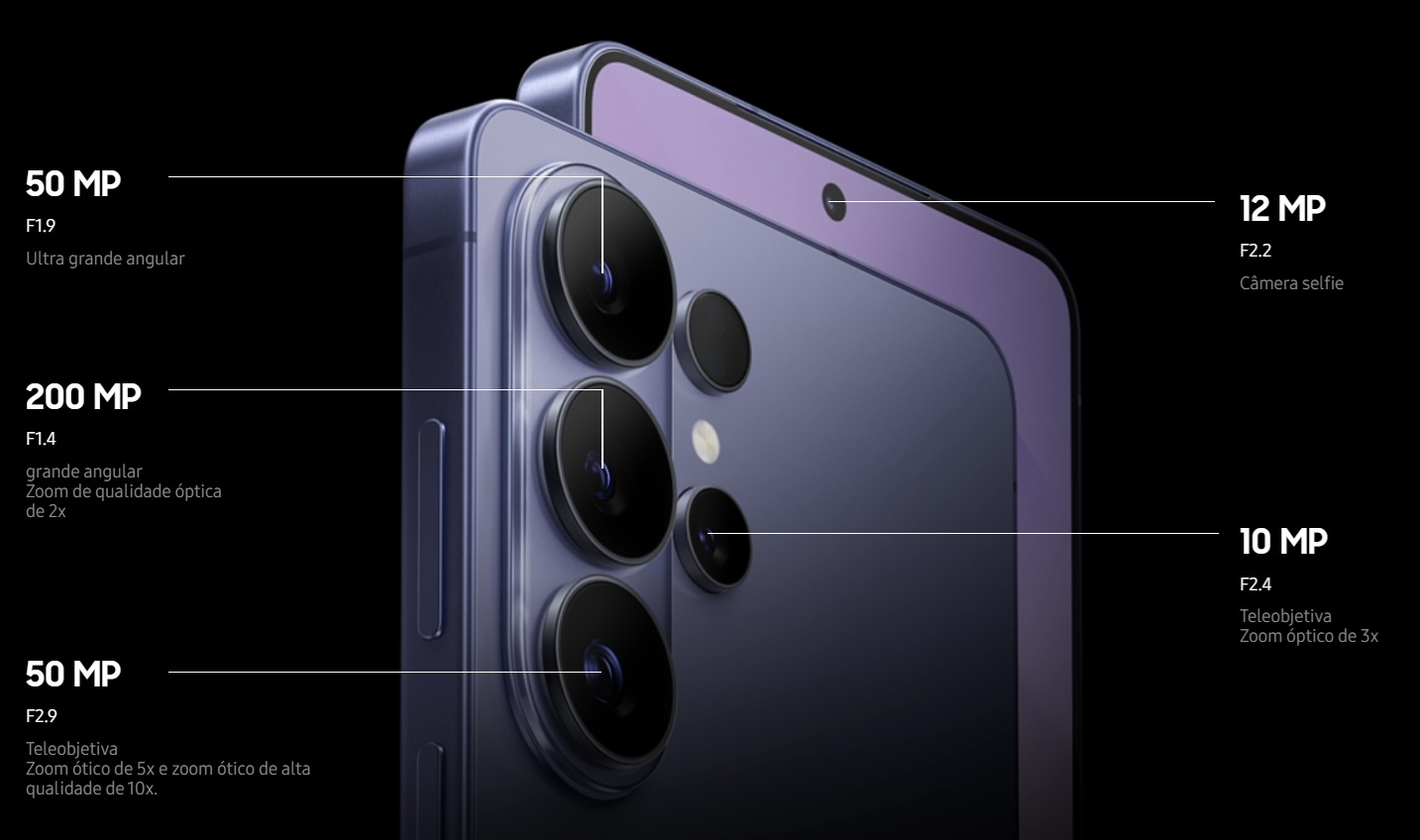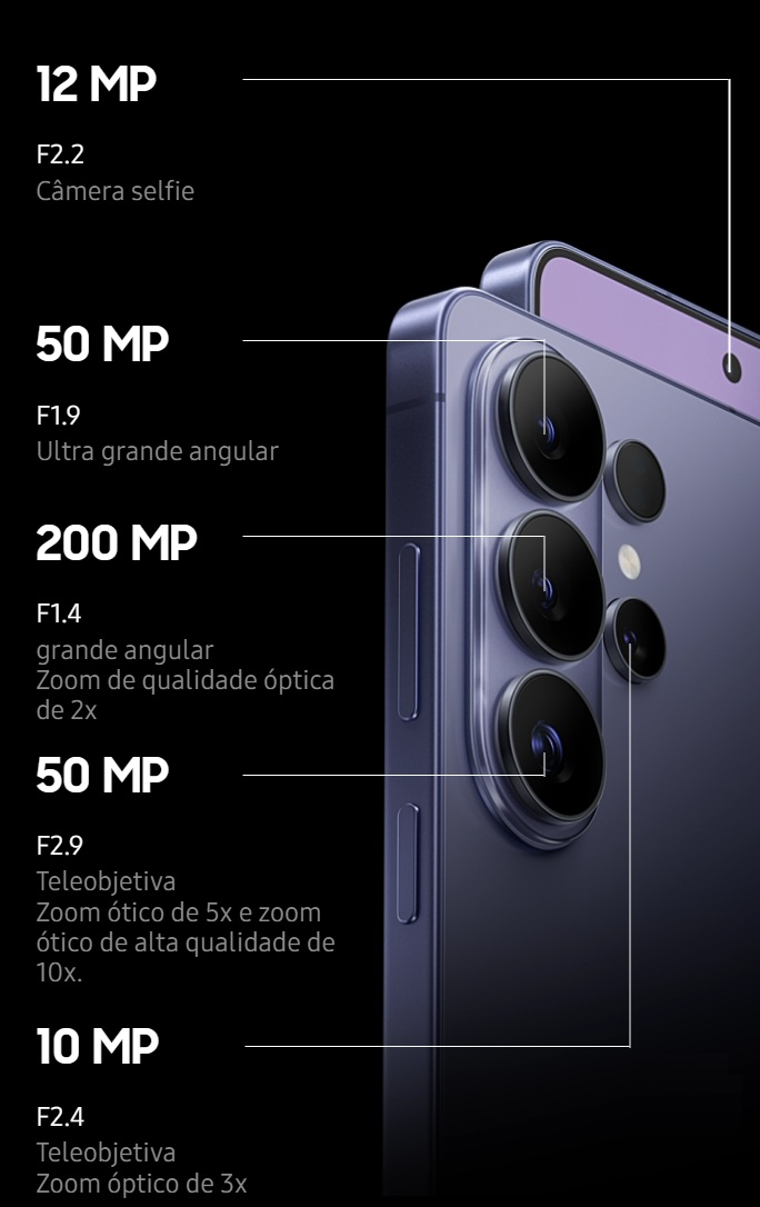 | Cámara Principal | • 200 MP, f/1.4, 23mm (wide), 1/1.3", 0.6µm, multi-directional PDAF, OIS • 10 MP, f/2.4, 67mm (telephoto), 1/3.94", 1.0µm, PDAF, OIS, 3x optical zoom • 50 MP, f/2.9, 111mm (telephoto), 1/2.52", 0.7µm, PDAF, OIS, 5x optical zoom • 50 MP, f/1.9, 120˚ (ultrawide), 1/2.5", 0.7µm, dual pixel PDAF, Super Steady video • Funciones avanzados: Laser AF, Best Face, Horizon Lock, LED flash, auto-HDR, panorama • Video: 8K@24/30fps, 4K@30/60/120fps, 1080p@30/60/120/240fps, 10-bit HDR, HDR10+, stereo sound rec., gyro-EIS |