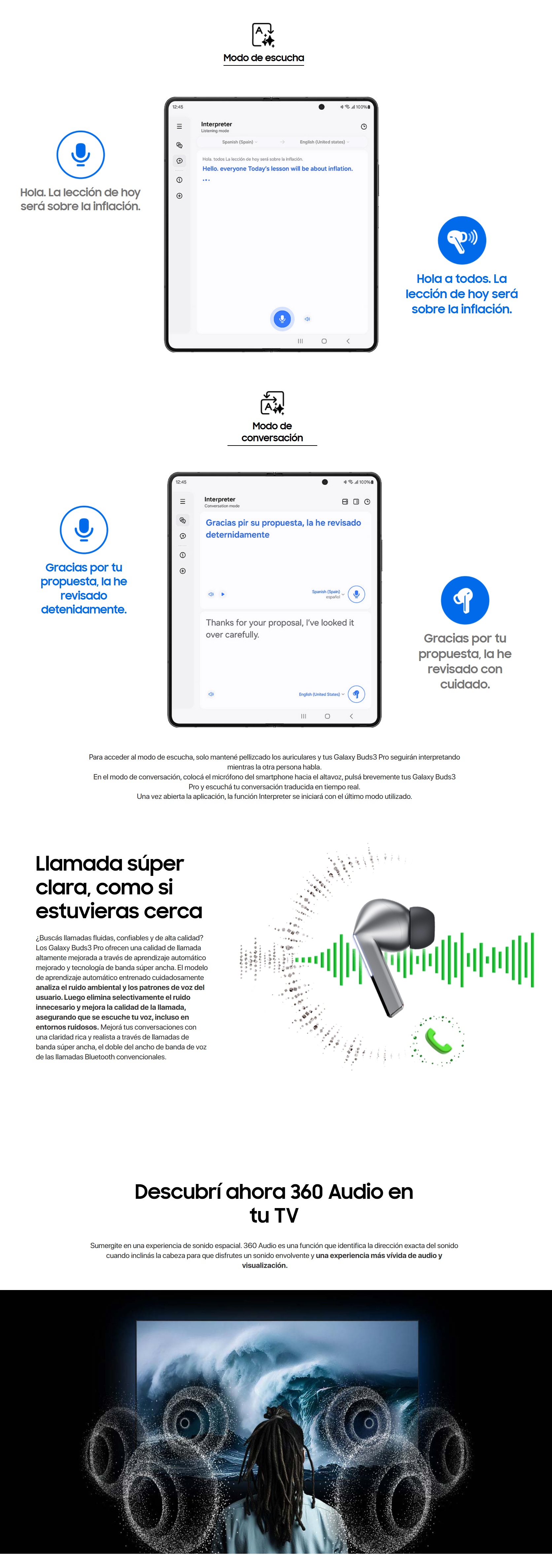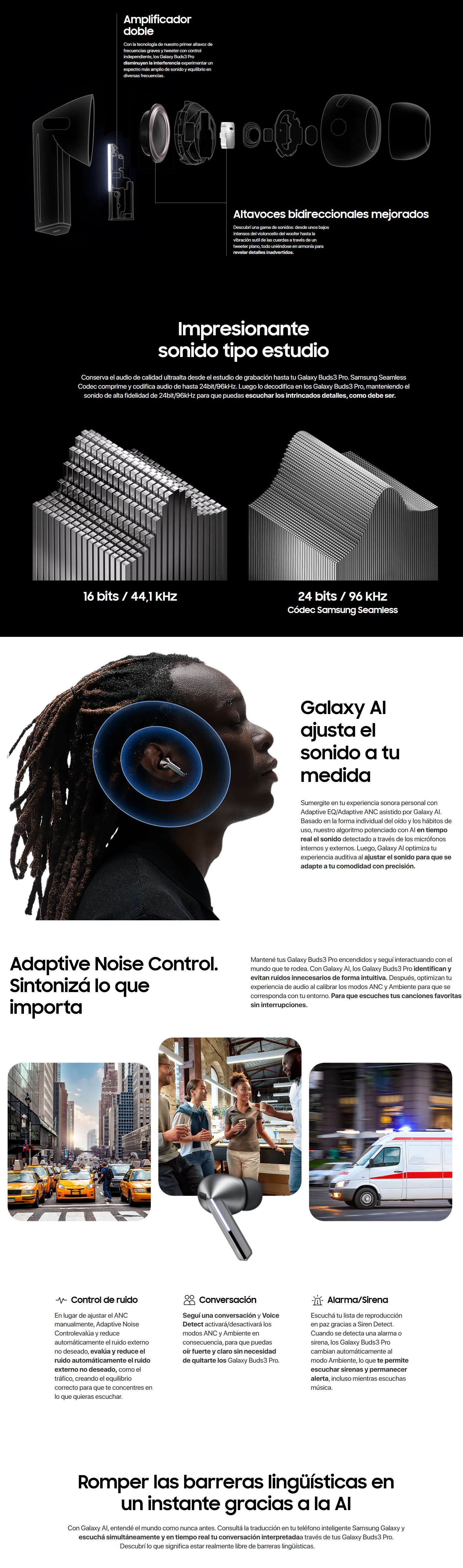 Audio | Parlantes Bidireccionales Sonido ambiental Control de ruido adaptativo Cancelación activa de ruido Detección de voz Audio 360 Detección de sirena Ecualizador adaptativo ANC adaptivo Banda súper Ancha |