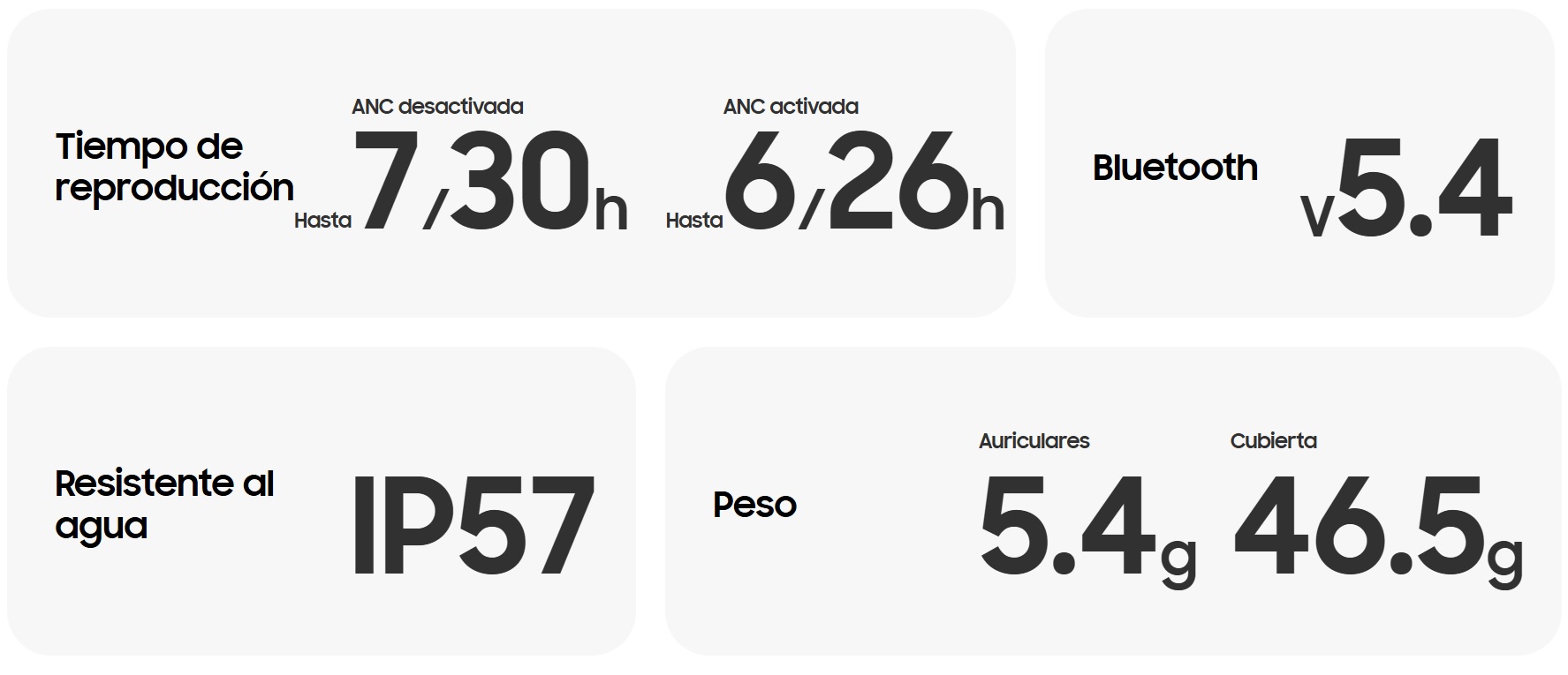 Duración de la batería | Tiempo de conversación (ANC activado): Hasta 4.5 Horas Tiempo total de conversación (ANC activado): Hasta 20 horas Tiempo de reproducción de música (ANC activado): Hasta 6 horas Tiempo total de reproducción de música (ANC activado): Hasta 26 horas Tiempo de conversación (ANC desactivado): Hasta 5 Horas Tiempo total de conversación (ANC desactivado): Hasta 22 horas Tiempo de reproducción de música (ANC desactivado): Hasta 7 horas Tiempo total de reproducción de música (ANC desactivado): Hasta 30 horas |