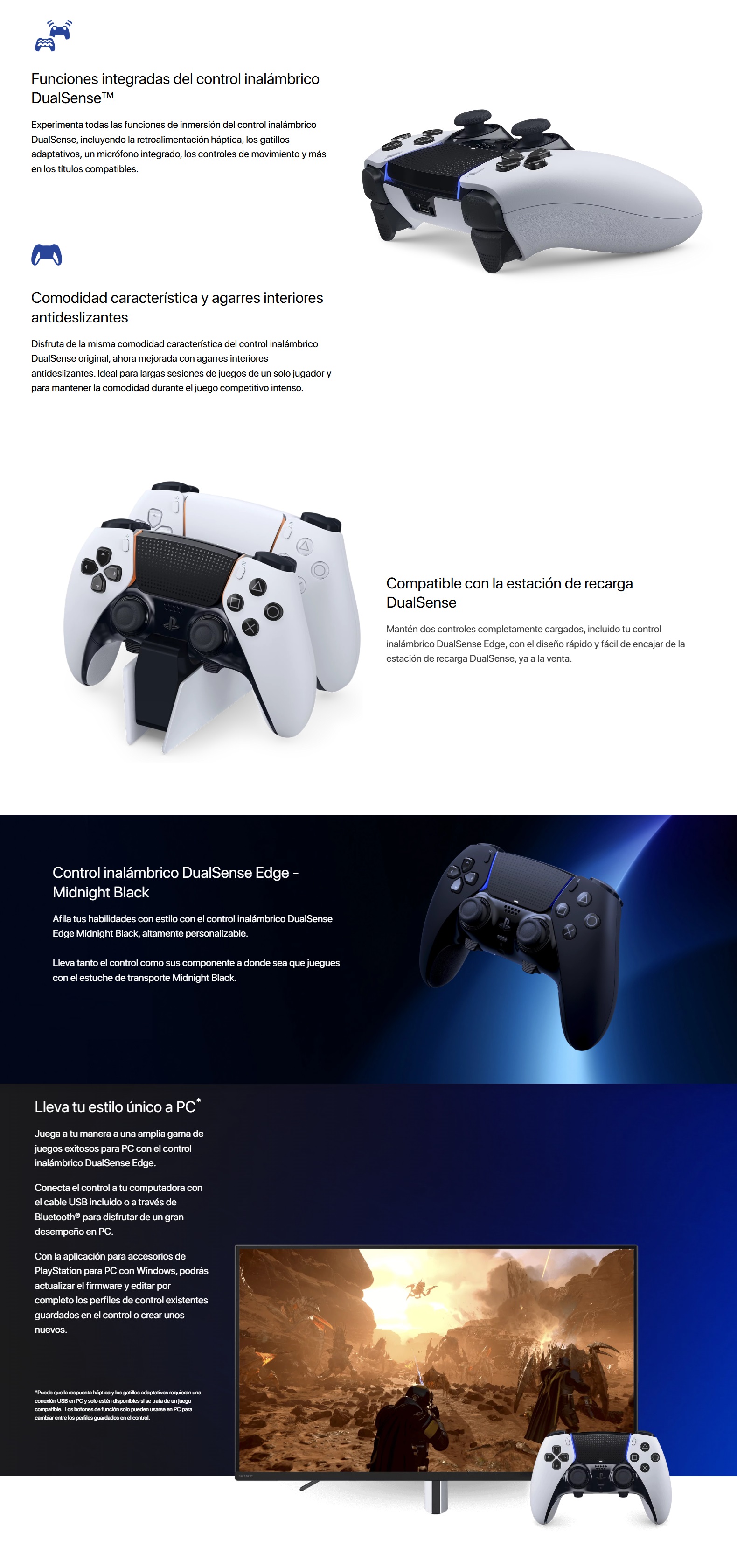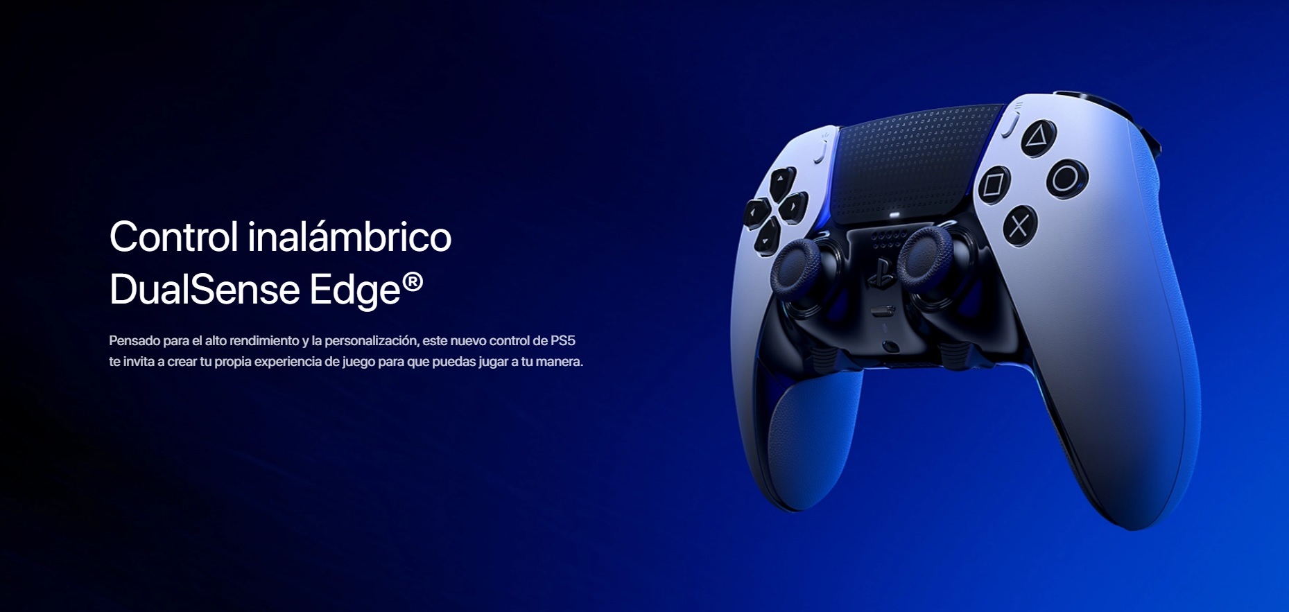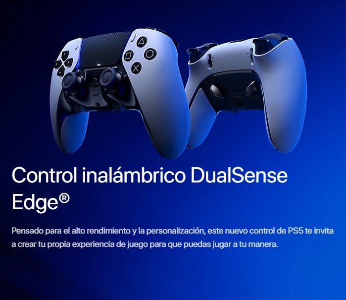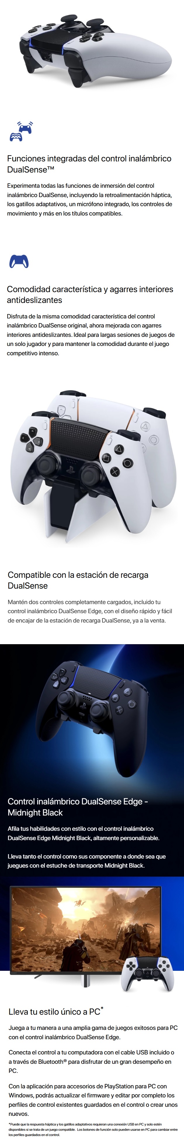 | Incluye | Control inalámbrico DualSense Edge - Cable trenzado USB - 2x tapas estándar - 2x tapas de domo alto - 2x tapas de domo bajo - 2x botones traseros domo medio - 2x botones traseros tipo palanca - Carcasa del conector - Estuche de transporte |