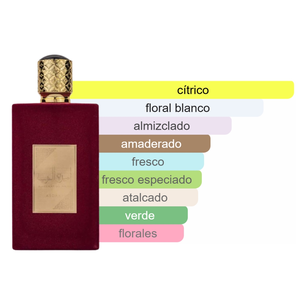 Ameerat Al Arab abre con un frescor cítrico encabezado por la bergamota, aportando un inicio brillante y chispeante. En el corazón, el almizcle blanco y la sábila crean una sensación limpia, suave y ligeramente acuática. La base se vuelve más intensa y sensual con el jazmín, el almizcle y toques de maderas cálidas, culminando en un fondo de oud que aporta carácter oriental y profundidad. Es una fragancia que combina lo fresco con lo amaderado, ideal para quienes buscan un aroma elegante con un toque exótico.