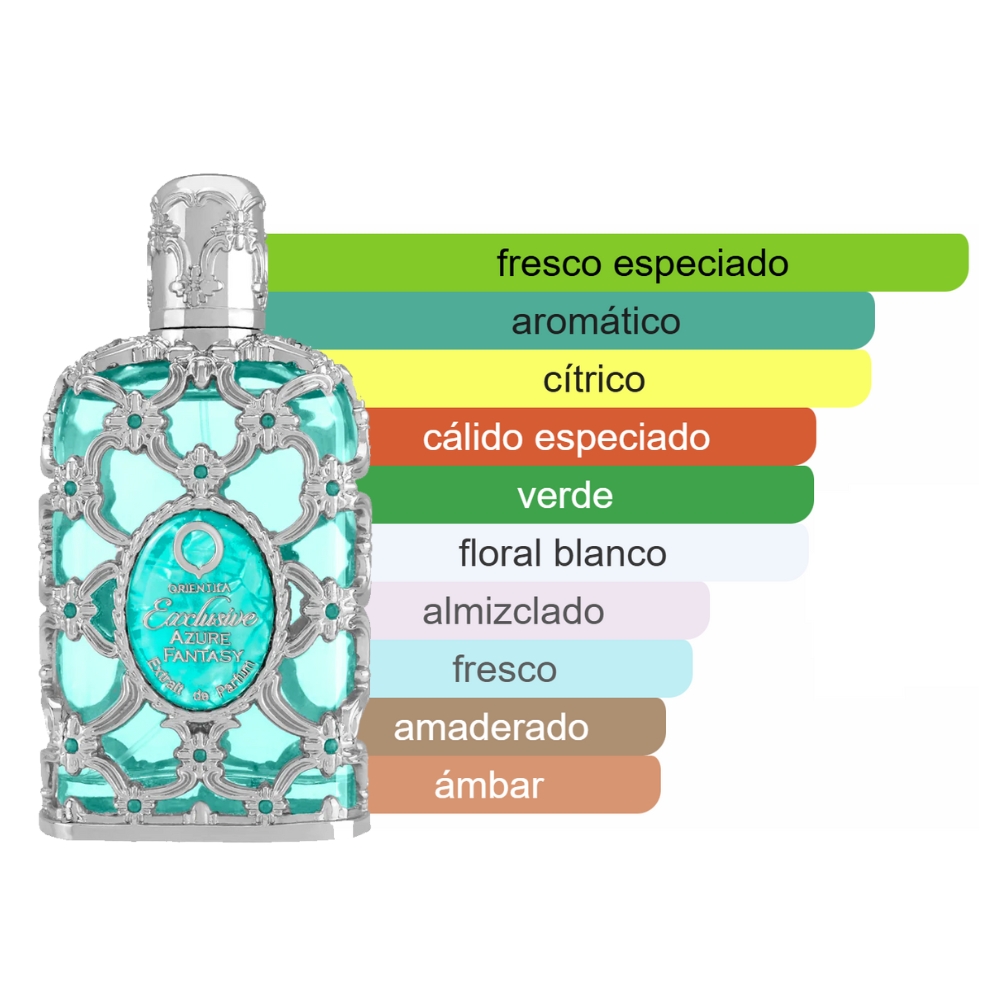 Exclusive Azure Fantasy es una fragancia versátil que combina frescura y elegancia, ideal para el día a día o climas cálidos. La combinación de bergamota, menta y jengibre en las notas de salida crea un arranque enérgico, mientras que el corazón floral añade un toque refinado. Las notas de fondo, con el almizcle y la madera de gaiac, aseguran una presencia persistente y elegante. Es una opción perfecta para quienes buscan una fragancia fresca pero con un carácter definido y atractivo.