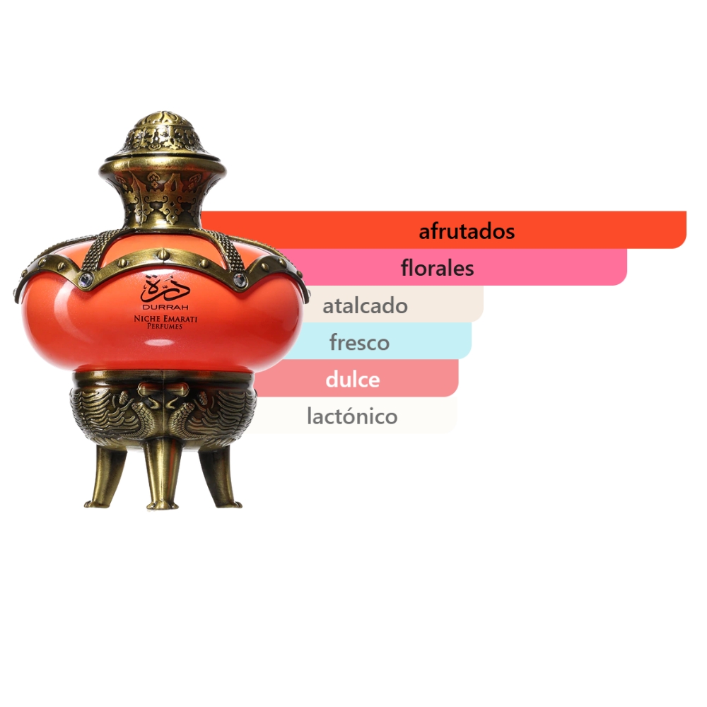 Durrah es un perfume dulce y floral, donde el durazno jugoso y la peonía abren con suavidad luminosa.