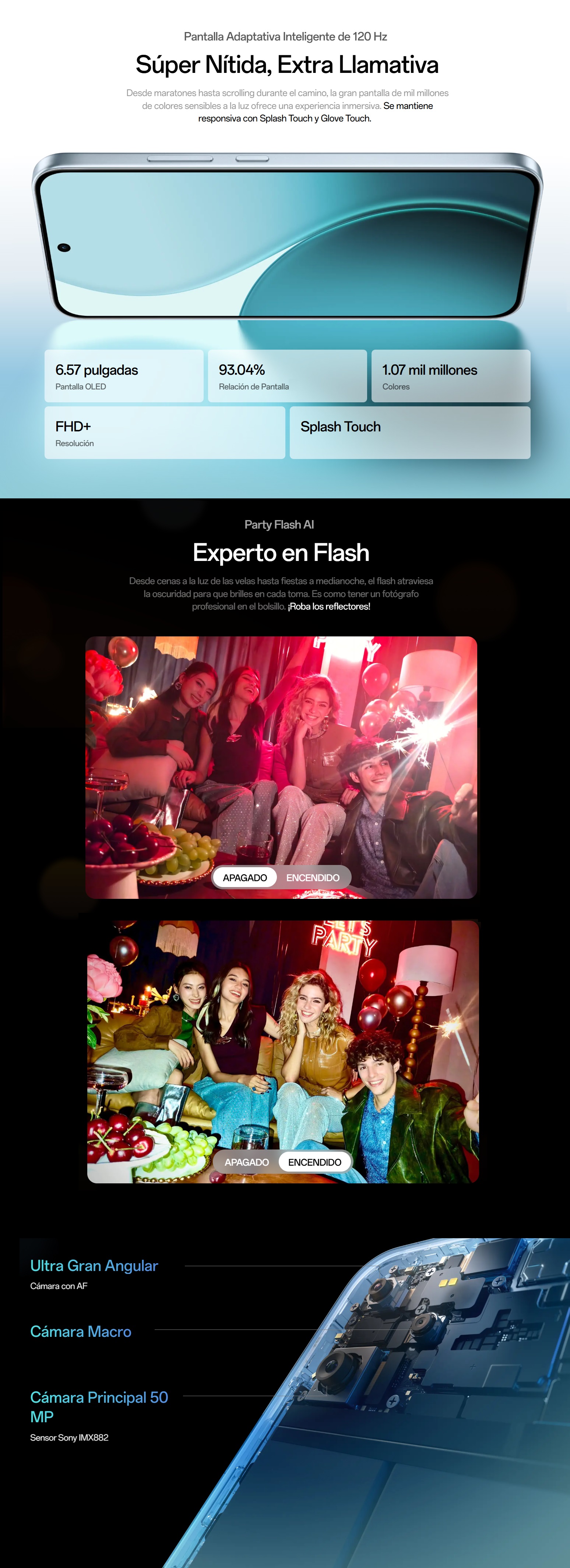 | Cámara Principal | • 50 MP, f/1.8, 26mm (wide), 1/1.95", 0.8µm, PDAF, OIS • 8 MP, f/2.2, 16mm, 112˚ (ultrawide), 1/4.0", 1.12µm, AF • 2 MP (macro) • Color spectrum sensor, LED flash, HDR, panorama • Video: 4K@30fps, 1080p@30/60/120fps, gyro-EIS, OIS |