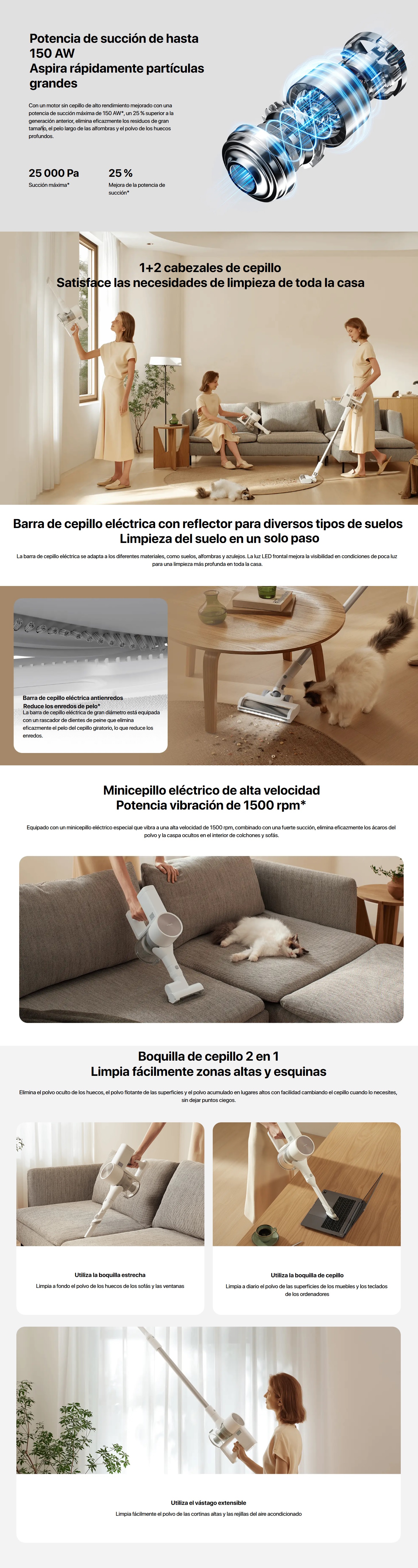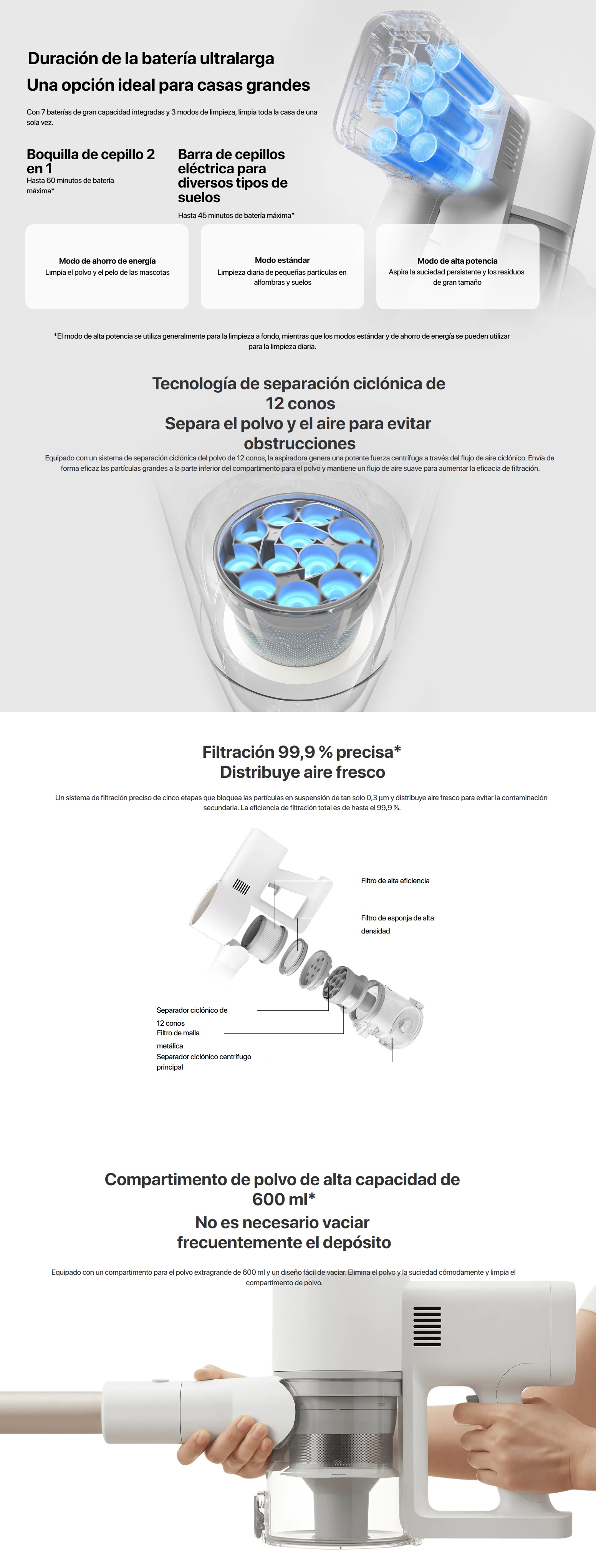 | Características | • Filtrado de alta eficiencia del 99,9 % • Separación de polvo y aire de 12 conos • 1+2 cabezales de cepillo • Boquilla de cepillo 2 en 1: Limpia fácilmente zonas altas y esquinas |