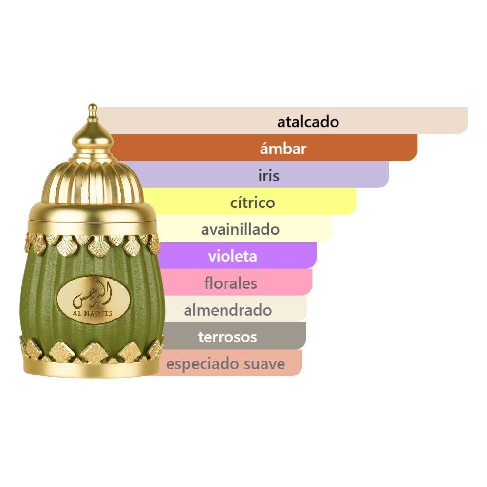Al Narjis es un perfume elegante y refinado, con una apertura fresca y chispeante que rápidamente se transforma en un corazón cálido y aterciopelado. Comienza con bergamota y pimienta rosa brillantes, sigue con un ámbar e iris sofisticado, y termina suave y envolvente con heliotropo y pachulí. Es perfecto para ocasiones especiales o para quienes buscan un aroma más serio y distintivo.