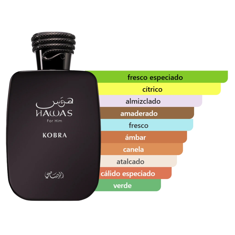 Una energía vibrante y una elegancia sofisticada se fusionan en el eau de parfum para hombre Rasasi Hawas Kobra. Esta composición oriental y amaderada ofrece una combinación de fuerza y refinamiento que realza la personalidad masculina. La fragancia se presenta con un acorde fresco de cítrico, que da paso a unas notas de corazón cálidas y especiadas y termina con una profundidad amaderada y un toque sensual de almizcle y de ámbar. Cada nota se manifiesta en un conjunto armonioso que deja una sensación duradera.