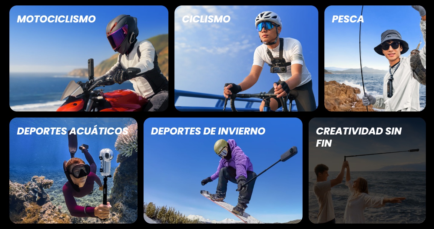 | Resolución de video | 360°: 8K: 7680x3840@30/25/24fps | 5.7K+: 5760x2880@30/25/24fps | 5.7K: 5760x2880@60/50/30/25/24fps | 4K: 3840x1920@100/60/50/30/25/24fps - Modo Lente única: 4K: 3840x2160@60/50/30/25/24fps | 2.7K: 2720x1536@60/50/30/25/24fps | 1080p: 1920x1080@60/50/30/25/24fps - Modo Selfie: 4K: 3840x2160@30/25/24fps | 2,7K: 2720x1536@120/100/60/50fps | 1080p: 1920x1080@120/100/60/50fps |